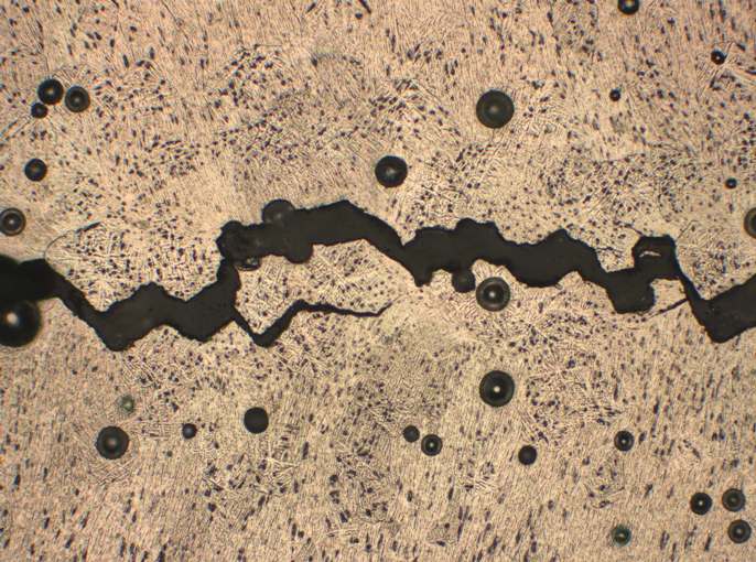 Heißriss in einer Laserschweißnaht eines Aluminiumwerkstoffs.