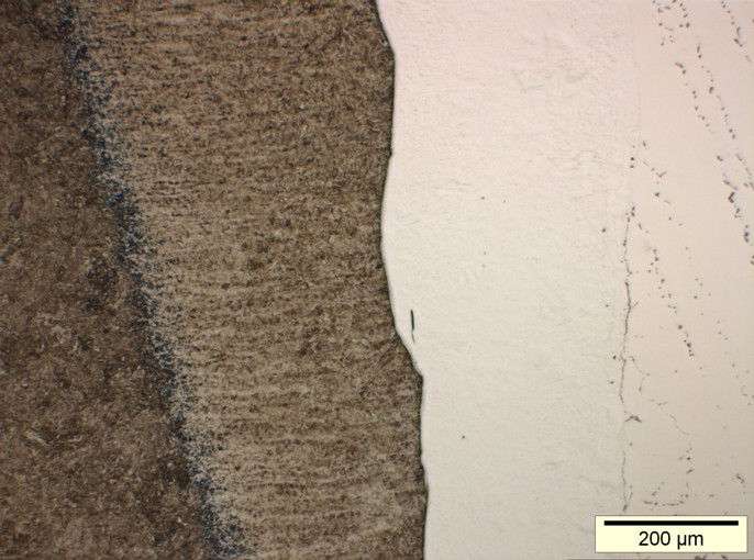 Gefügebereiche von links nach rechts: Stahlwerkstoff - Wärmeeinflusszone - Schweißnahtgefüge - Nickelbasislegierung